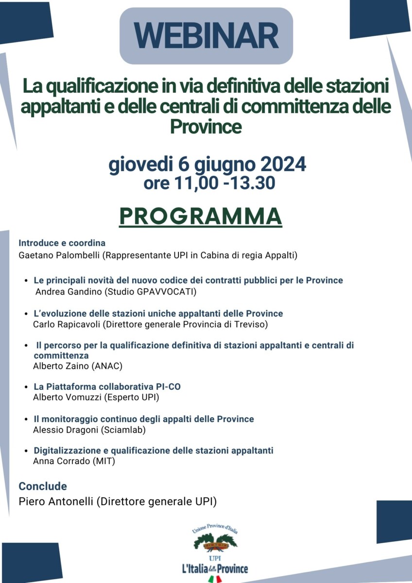 L’Unione delle Province d’Italia ha organizzato, in collaborazione con il MIT e con l’ANAC, il Webinar “La qualificazione in via definitiva delle stazioni appaltanti e delle centrali di committenza delle Province”, di cui si allega il programma.